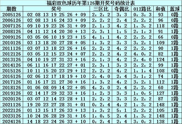 在第126期历史同期奖号中,红球三区分布总比例为35:42:43,奇偶总比例为63:57,012路比为39:37:44,和值分布在60-148之间,蓝球号码012路总比例为5:12:3。