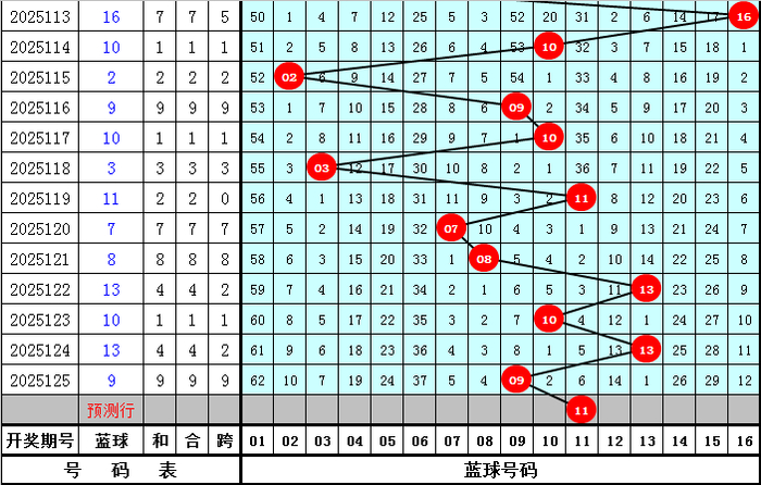 在历史同期第126期开奖中:蓝球号码012路比为5:12:3,本期注意蓝球开出2路号码,精选蓝球号码11。